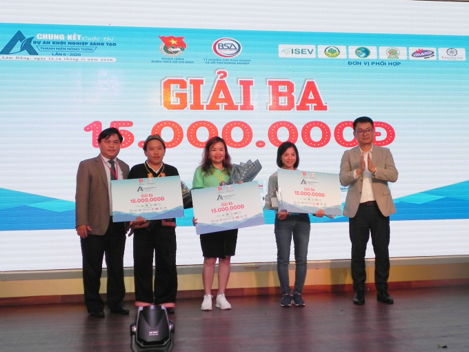 3 giải Ba cho các dự án là Gối thảo dược người Dao của Lý Thị Quyên, Dự án chăn nuôi và chế biến gà vi sinh của Ngô Thị Thanh Tâm (cùng tỉnh Bắc Kạn) và Chuỗi cung ứng và kinh doanh các sản phẩm từ cây Tam thất trồng ở Simacai của Giàng Seo Châu (Lào Cai). Mỗi dự án nhận 15 triệu đồng tiền mặt.